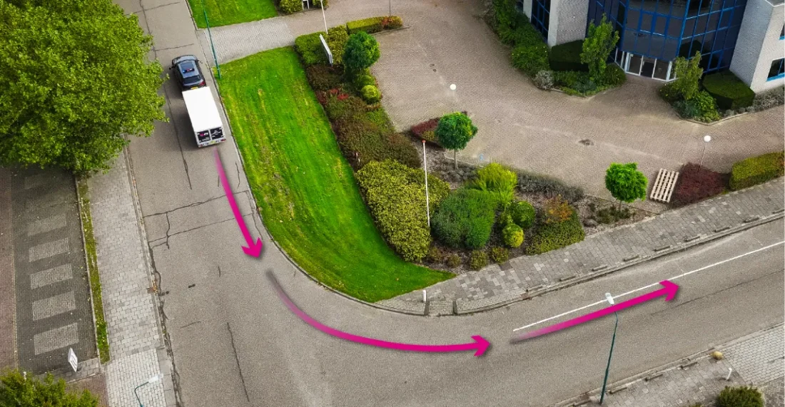 - Rijd voor de bocht achteruit eerst 5 meter voorbij het kruispunt. Zet je richting naar rechts aan voordat je tot stilstand komt.